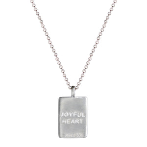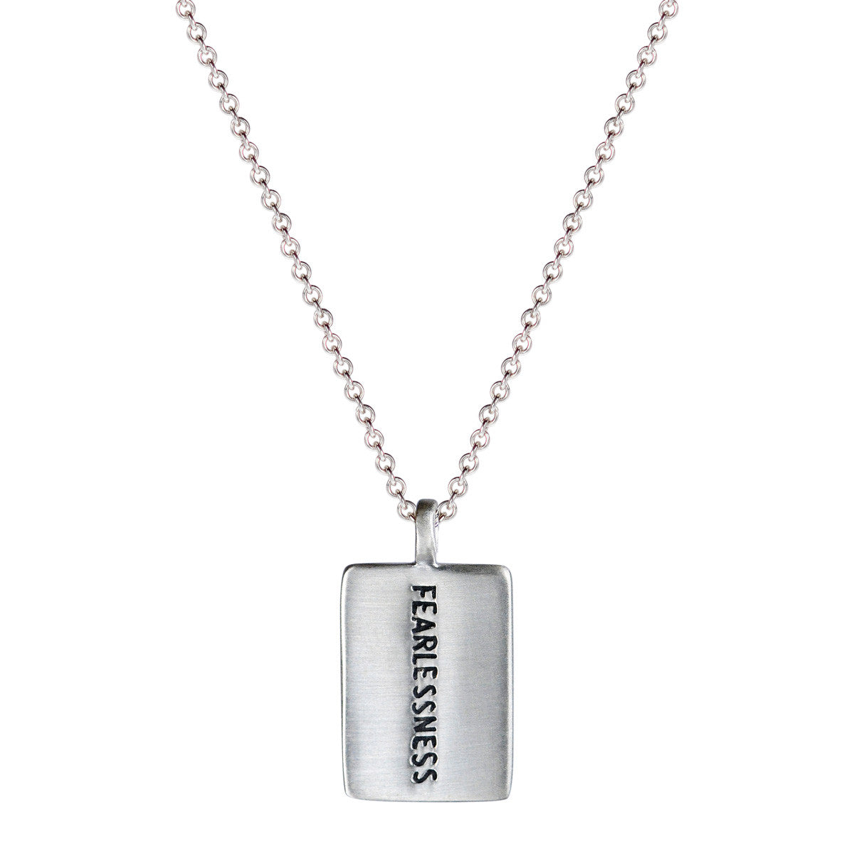 This recycled sterling silver pendant brings a graceful twist to the classic dog tag design, engraved with "Fearlessness" reminding us to approach life with an open heart and to be strong in the face of life's adversities. The pendant is engraved on the back with "Joyful Heart" and measures 1/2" wide by 3/4" long, hanging from a 16", 18", 20" or 22" sterling silver chain with a spring ring closure. 10% of the sale from each pendant goes directly to Joyful Heart Foundation.