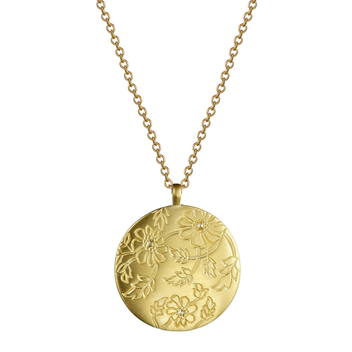 A beautiful statement piece, this circle paisley pendant is cast in recycled 18K gold with a hand engraved paisley pattern. Rose cut diamonds add sparkle and elegance. The pendant measures approximately 7/8" in diameter on a 16" or 18" 18K gold chain with a round lobster closure. All diamonds are conflict free.