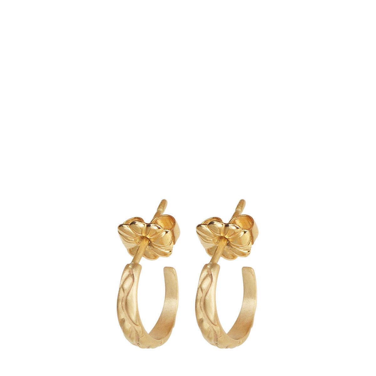 These classic tiny engraved hoop earrings hug the ear and are perfect for every day. The simple recycled 10K gold hoop earrings measure about 0.375” in diameter and hang on 14K gold ear posts.