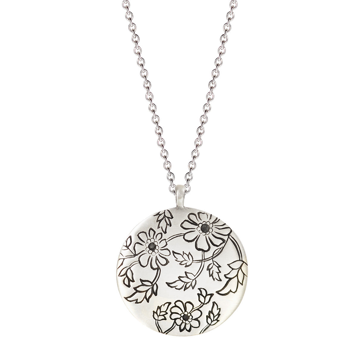 A beautiful statement piece, this recycled sterling silver pendant features an intricately engraved paisley disc with light grey oxidation. The disc measures approximately 7/8" in diameter on a 16" or 18" recycle sterling silver chain with a small round lobster clasp.