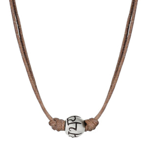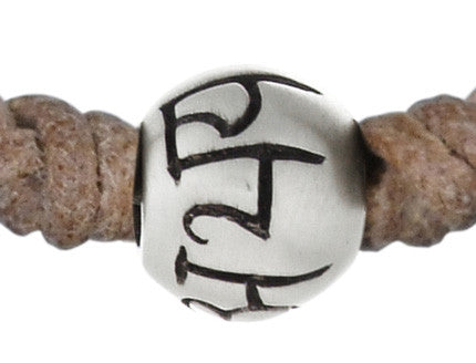 The Sanskrit symbol for 'Fearlessness' is engraved on a recycled sterling silver bead that sits between two knots on a 22" natural cotton cord with a toggle closure. Inscribed with the word 'Fearlessness' in English, the bead measures approximately 1/4" in diameter.