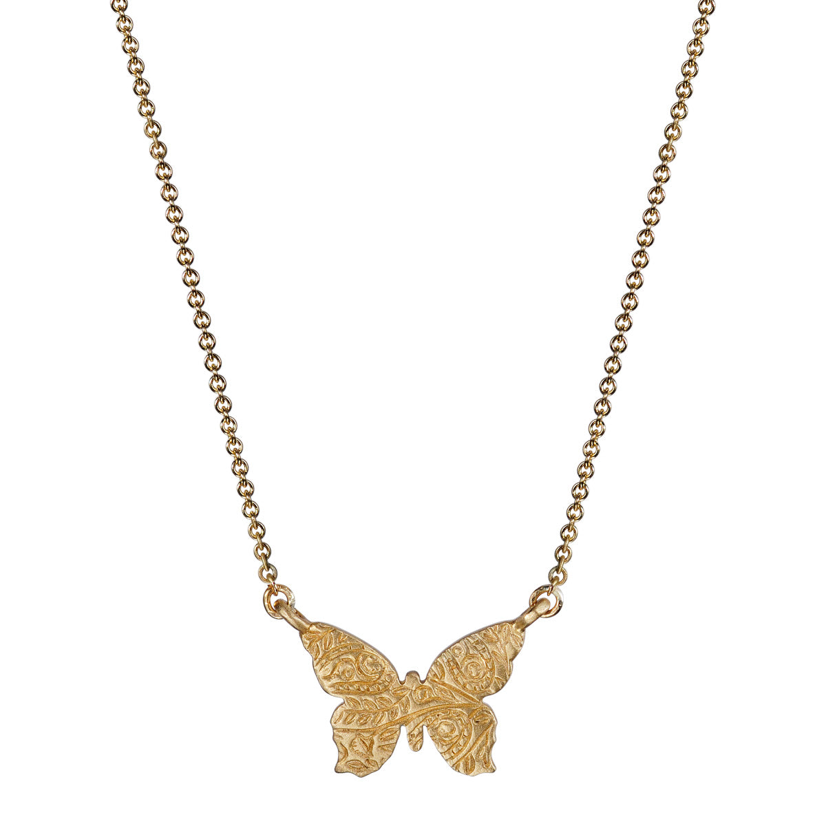 A delicate butterfly pendant is a symbol of renewal and transformation. Engraved with an intricate paisley motif, this recycled 10K gold butterfly is great for everyday wear. The butterfly measures approximately 3/8" length and 5/8" in width on 16" or 18" 10K gold chain with a spring ring closure.