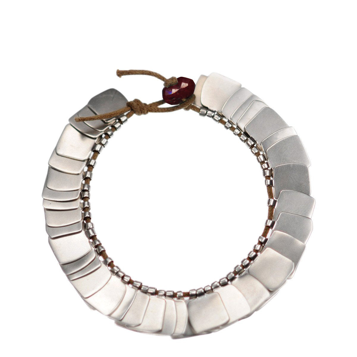 The inspiration for these hammered recycled sterling silver pieces was Tibetan prayer flags, flapping in the wind, and hung on mountain tops. Strung on natural-colored cotton cord with a ruby bead closure, the thin rectangular sheets of silver evoke a feeling of something old and worn; that has been passed down from generation to generation. The bracelet measures 7" in length.