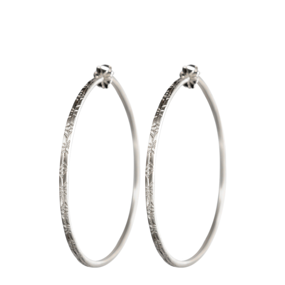 These classic engraved hoop earrings are perfect for day or night. The recycled sterling silver hoop earrings measure about 1 3/4" in diameter with a post and ear nut closure.