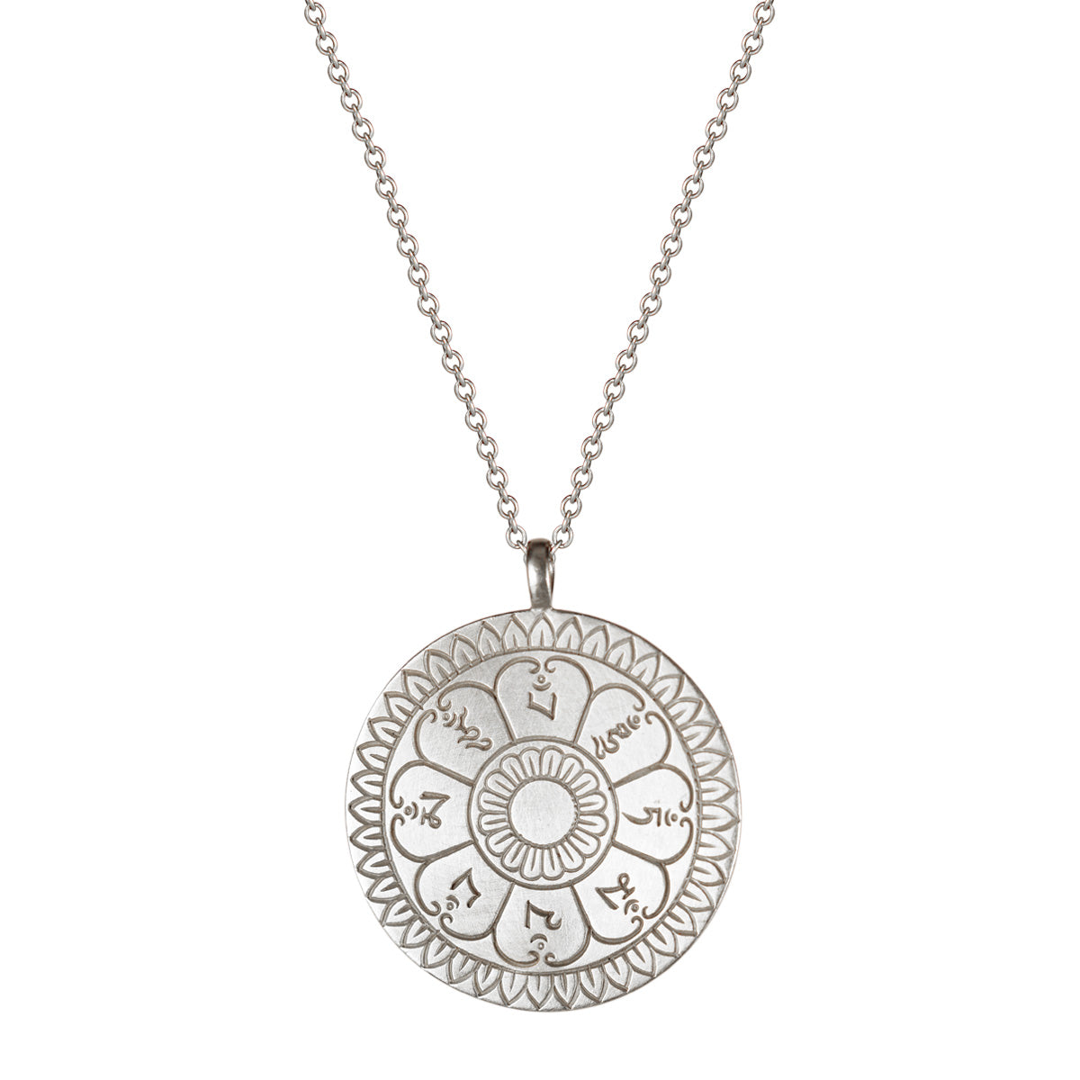 The hand bell is an essential element in Tibetan rituals. This recycled sterling silver disc, measuring approximately 1" in diameter, is engraved with the 8 bodhisattvas in the form of a lotus flower. Each petal has a symbol of the 8 goddess offerings: beauty, flowers, garlands, incense, song, light, dance and perfume. The pendant hangs on a 16" or 18" silver chain with a small lobster clasp.