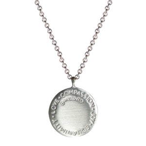 'The Four Immeasurables', Love ('Maitri'), Compassion ('Karuna'), Joy ('Mudita') and Equanimity ('Upeksa'), is a Tibetan vow that encourages us to focus our attention on helping others. The vow is engraved in Tibetan on a sterling silver disc, measuring approximately 3/4" in diameter, and hangs from a 16" or 18" silver chain with a silver lobster claw closure.