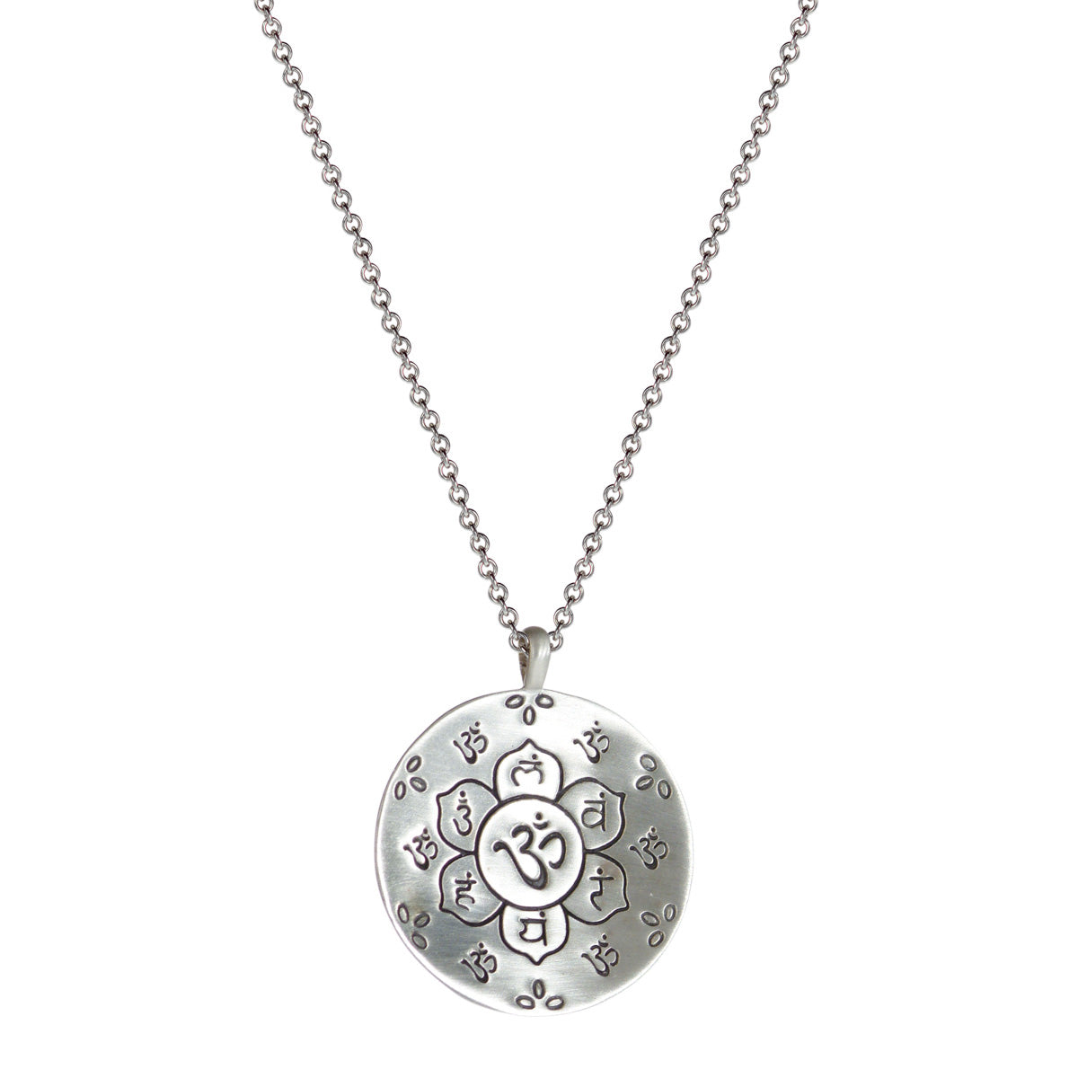 The chakras are invisible energy centers of the body positioned along the spinal cord from the base of the spine to the top of the head. They are centers of consciousness. All seven chakras are engraved within a lotus flower and surrounded by the Sahasrara Chakra on this recycled sterling silver pendant, measuring approximately 7/8" in diameter. The pendant is available on a 16" or 18"sterling silver chain with a spring ring closure.