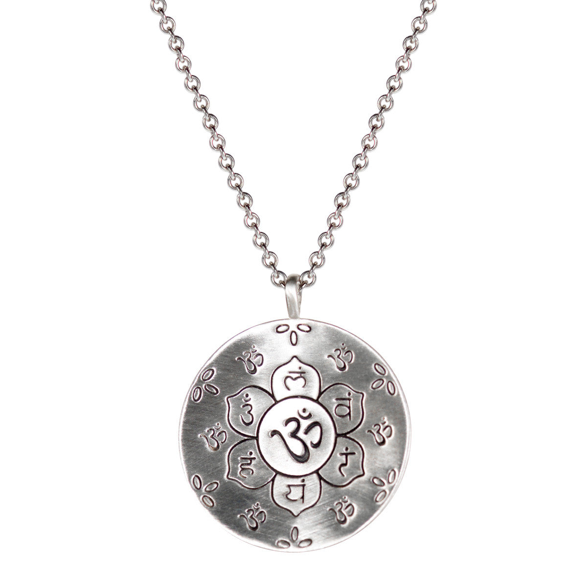The chakras are invisible energy centers of the body positioned along the spinal cord from the base of the spine to the top of the head. They are centers of consciousness. All seven chakras are engraved within a lotus flower and surrounded by the Sahasrara Chakra on this recycled sterling silver pendant, measuring approximately 1 1/8" in diameter. The pendant is available on a 16" or 18" sterling silver chain with a lobster claw clasp.
