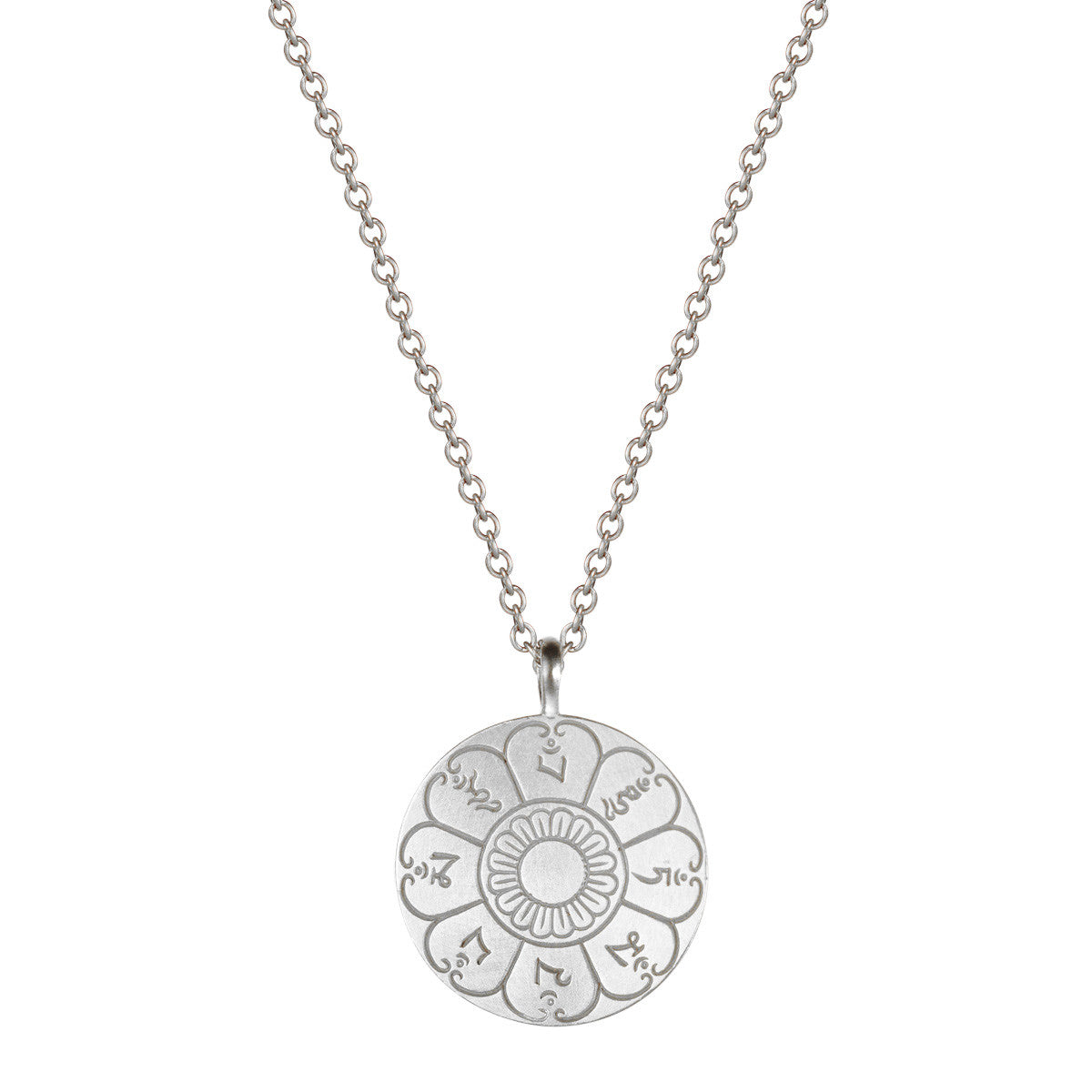 The hand bell is an essential element in Tibetan rituals. This recycled sterling silver disc, measuring approximately 3/4" in diameter, is engraved with the 8 bodhisattvas in the form of a lotus flower, of which each petal has a symbol of the 8 goddess offerings: beauty, flowers, garlands, incense, song, light, dance and perfume. The pendant hangs on a 16" or 18" silver chain with a small lobster clasp.