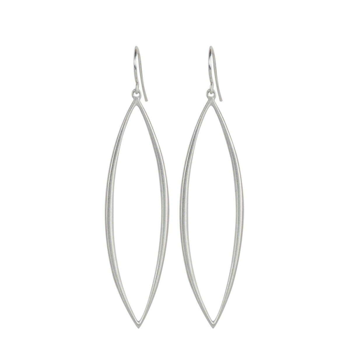 These recycled sterling silver earrings hang heavier at their center while floating lightly away at their ends with an elegant graduating line. This fine classic style becomes something between an ellipse and a crescent. The earrings hang 2 3/8” from the ear wire. Two round lines 2.5mm thick gracefully bow 5/8” wide from each other.