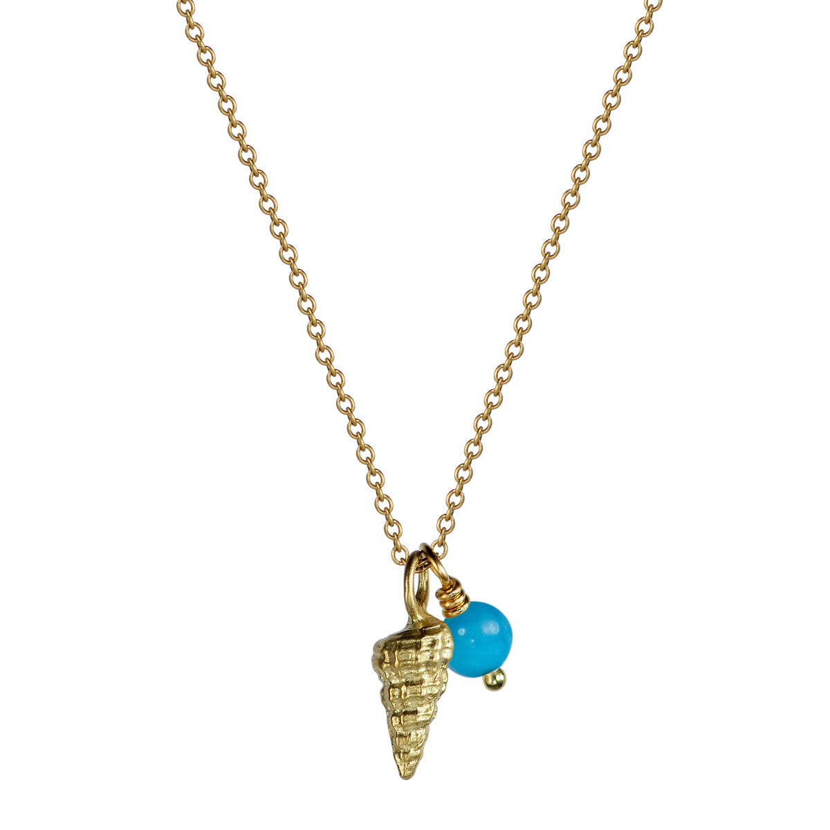 A recycled 18K gold shell, measuring approximately 1/2" in length and 1/8" in width, hangs on a fine 18K gold chain with a 4mm turquoise bead. The pendant is available on a 16" or 18" chain with a spring ring closure.