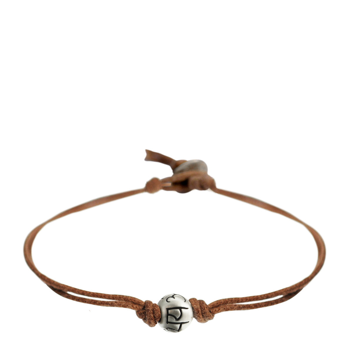 A recycled sterling silver bead, engraved with the Sanskrit symbol 'Abhaya' or 'Fearlessness,' sits between two knots on waxed natural cotton cord with a sterling silver button. The bead is approximately 1/4" in diameter and the bracelet measures 7" in length.