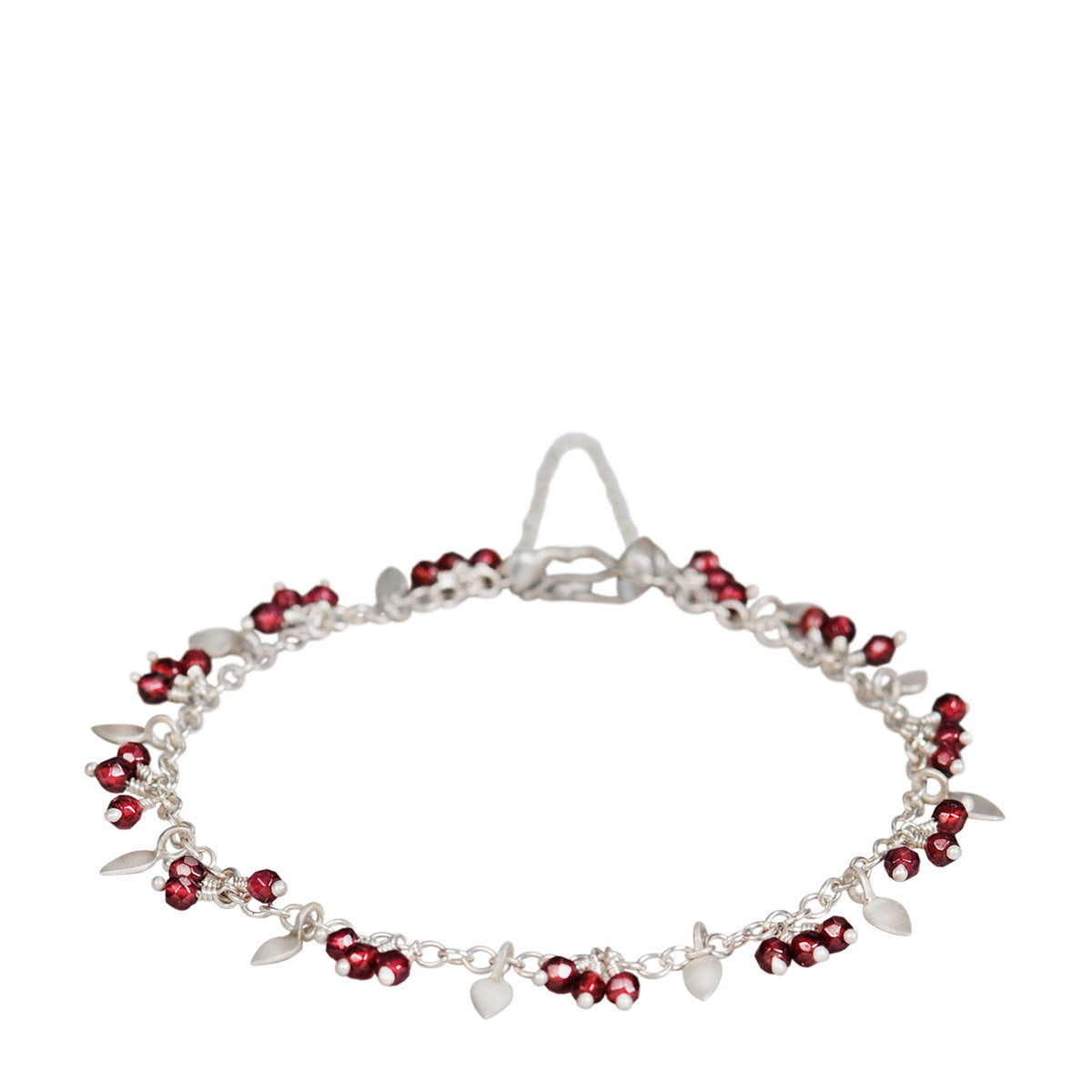 Delicate recycled sterling silver petals and garnet beads create a sparkly, elegant bracelet. This limited edition bracelet features tiny petals with clusters of hand beaded faceted round garnets. The bracelet measures 7" in length and is secured with a hook and eye closure with a safety chain.