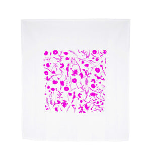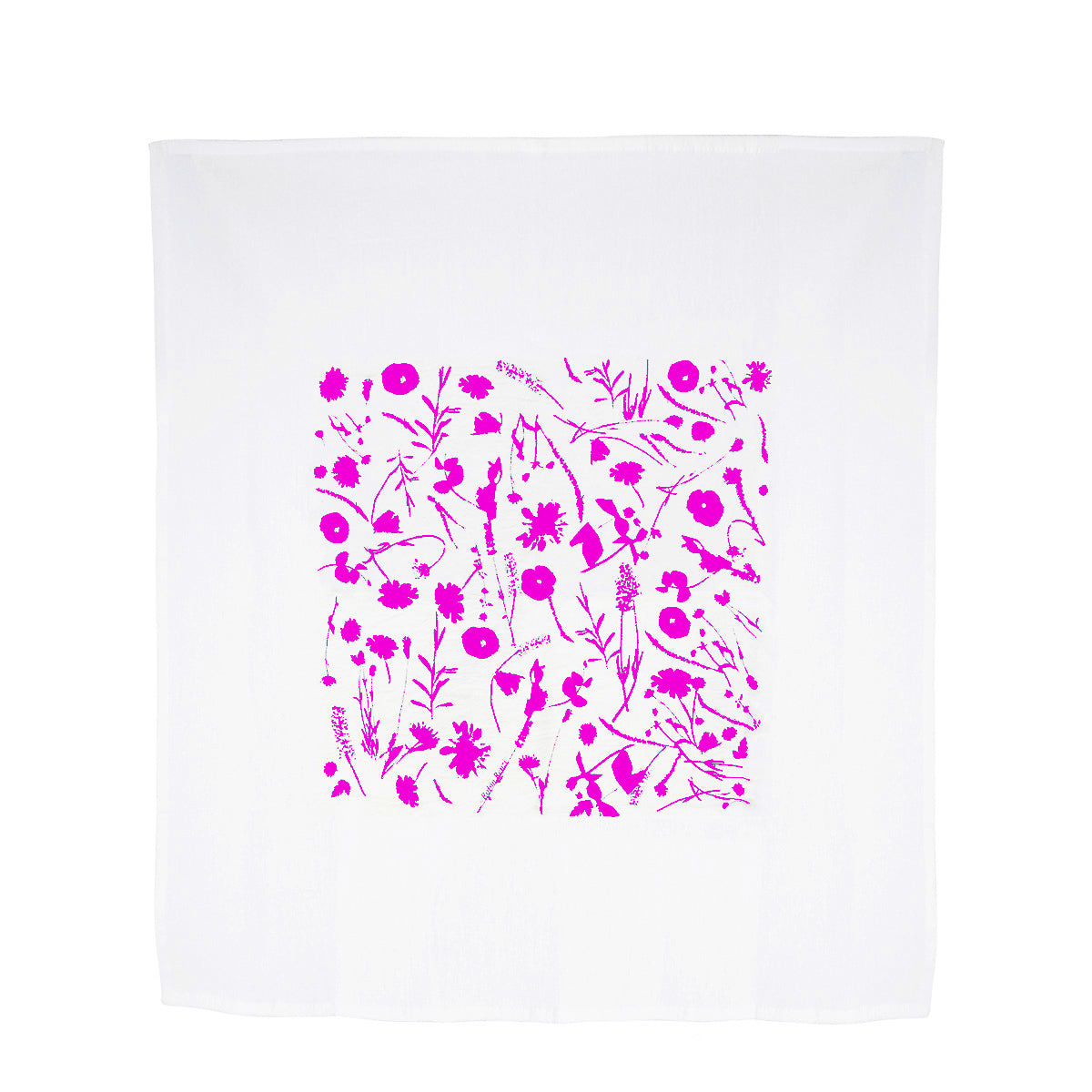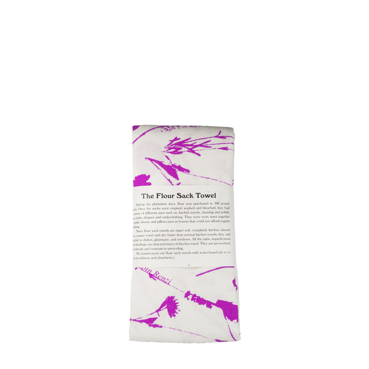 Designer Robin Renzi created this artwork using flowers from her garden that she hand-pressed and photographed to create an intricate pattern of her home-grown botanicals. The towels are screen printed by hand in small batches by the Downtown General Store in Honolulu, Hawaii. Crafted from repurposed flour sacks from the 1800’s, they are super soft, absorbent, and fast drying. In vibrant pink, the whimsical design makes it the perfect gift! These towels are 27 x 27” and are screen printed by hand using water-based inks to maintain softness. Food is love, happy cooking!
