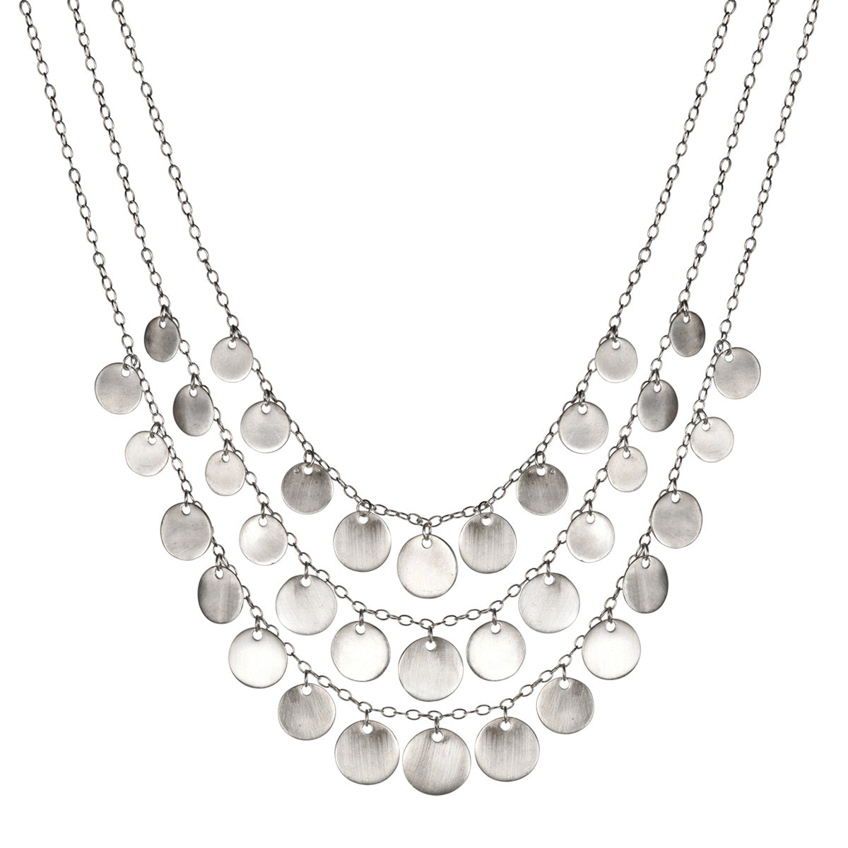 A true statement piece, this recycled sterling silver chain features three rows of discs that catch the light and shimmer with movement. The discs vary in diameter from 3/8" to 5/8" on a chains that measure 16.75", 18.25"  and 19.75" respectively with a hook and eye closure.