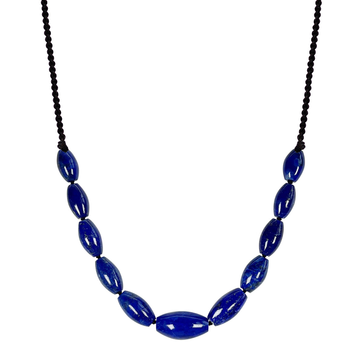 As the stone of wisdom and truth, lapis embodies the wonder of staring up at a night sky. There are violet and gold inclusions that swirl like a thousand suns in galactic dust. These custom cut smooth oval lapis beads are hand-knotted on black string. The necklace features 11 beads with approximately 139 carats and graduate from 1” x 1/2” to 1/2” x 5/16”. The beaded section measures 7.75 inches with the total necklace measuring 18 inches and is finished with a recycled 10K gold button closure. Made in NYC. All stones are ethically sourced.