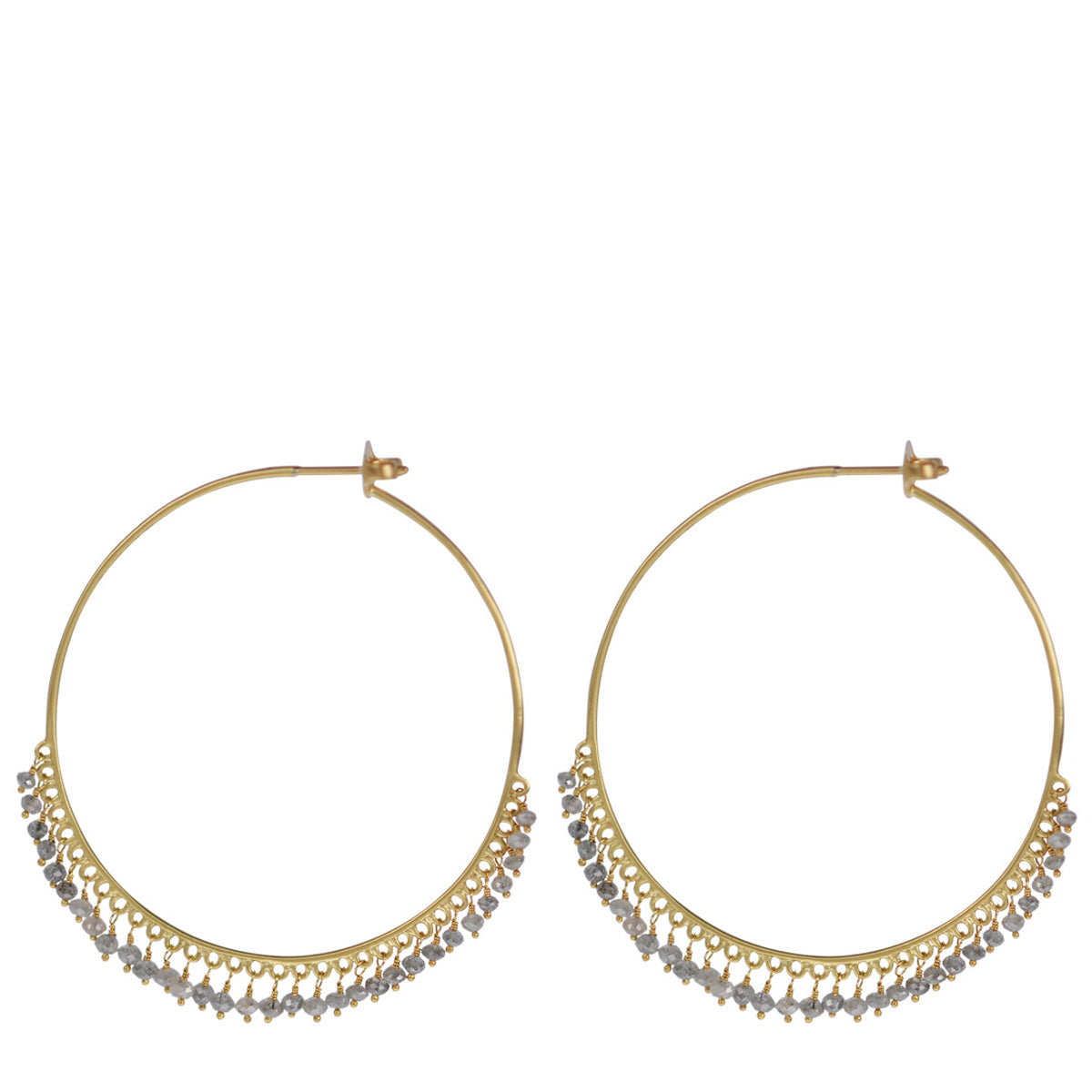 Reminiscent of the bohemian glamour of the 1970's, these recycled 18K gold hoops are hand beaded with grey diamonds, sparkling with movement. These lightweight hoops measure approximately 2" in diameter and have an approximate total carat weight of 7.68. All diamonds are conflict free.