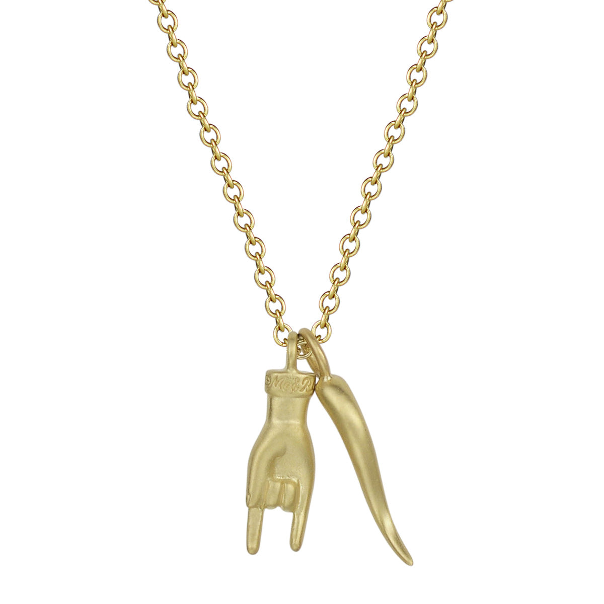 Designer Robin Renzi re-created this trinket pendant to commemorate the 25th anniversary of Me&Ro. The Cornuto hand and Italian horn were gifts from her Italian grandmother. “I believe now as I did then that by wearing these charms I was empowered to be strong, to believe in myself and to feel love.” The hand measures approximately 5/8” in length and 1/4" in width. The Italian horn measures 3/4” in length and 1/8” at its widest point. The pendant is available on a 18” 18K gold chain finished with a lobster clasp closure.