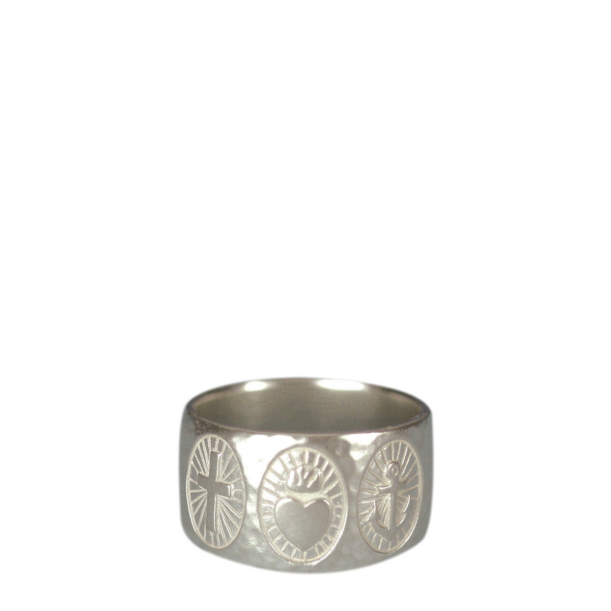 The Heart has also long been recognized across cultures as a symbol of charity, joy and compassion. The Anchor is a symbol of hope: secure, immovable and anchored in the Divine. The Cross is one of the oldest and most universal of all symbols and is said to protect against evil and is a source of strength and faith. Each symbol is engraved on a hammered recycled sterling silver band measuring approximately 1/2" wide.