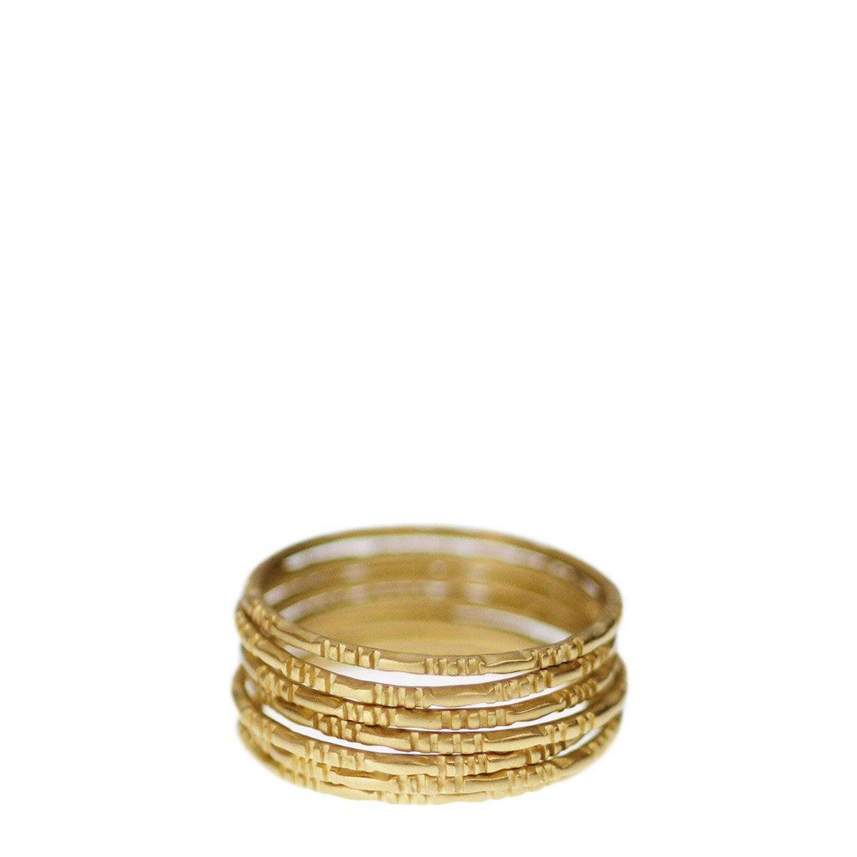 A set of seven delicate etched bands are simple and beautiful. Made of recycled 18K gold, these rings look great stacked or worn alone. Each ring measures approximately 1/16" in width and is available in sizes 5-8.